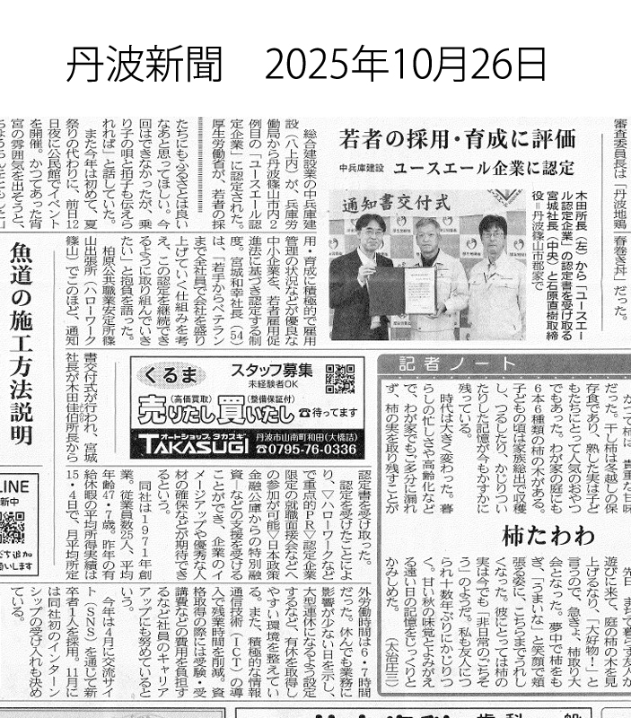 | 許可番号 | 土木・建築・造園・舗装 とび・土工・水道施設工事兵庫県知事(特-4)第752376号 水道事業指定給水工事篠山市指令水 第48号 産業廃棄物収集運搬第2808022777号 木材業 兵庫県知事第2458号 特定労働者派遣事業派28‐301033 | |||||||||||||||||||||||||||